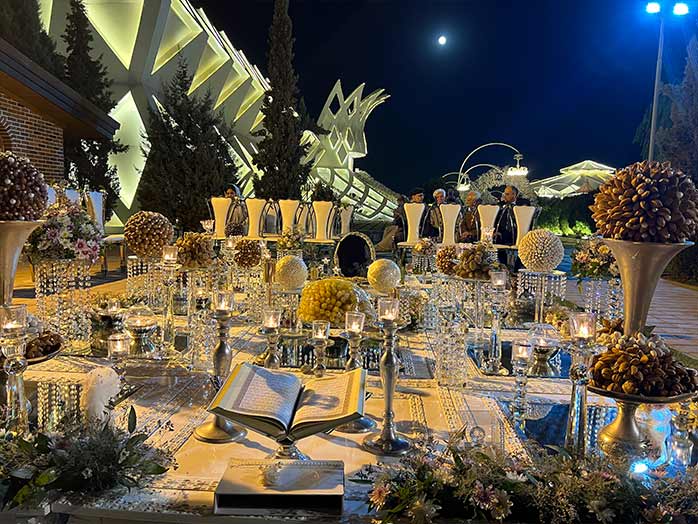 اگر عاشق فضای باز هستی، سفره عقد میتواند کنار درختان و در محوطه باغ چیده شود، در حالی که نور طبیعی و صدای آب، حس آرامش و عشق را دوچندان میکند.
